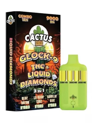 In the ever-evolving world of cannabis products, the Cactus Labs Glock 9 THC + Liquid Diamonds 3in1 Vape stands out, offering a powerful combination of celebrated strains and innovative technology. With an impressive 9000mg potency, this vape blends the sought-after flavors and effects of Blue Dream, LA Kush Cake, and Gorilla Glue into a single, remarkable product. Let’s dig deeper into what makes this vape so special.