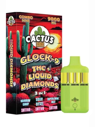 In conclusion, the Rainbow Candy | Sour Diesel | Superlemon Haze Cactus Labs Glock 9 THC + Liquid Diamonds 3in1 Vape 9000mg is not just another cannabis product; it’s a journey through flavors and sensations that every cannabis connoisseur should consider. From its unique flavor profile to its high potency and advanced extraction technology, this vape experience transcends the ordinary.